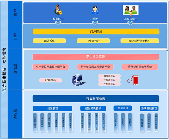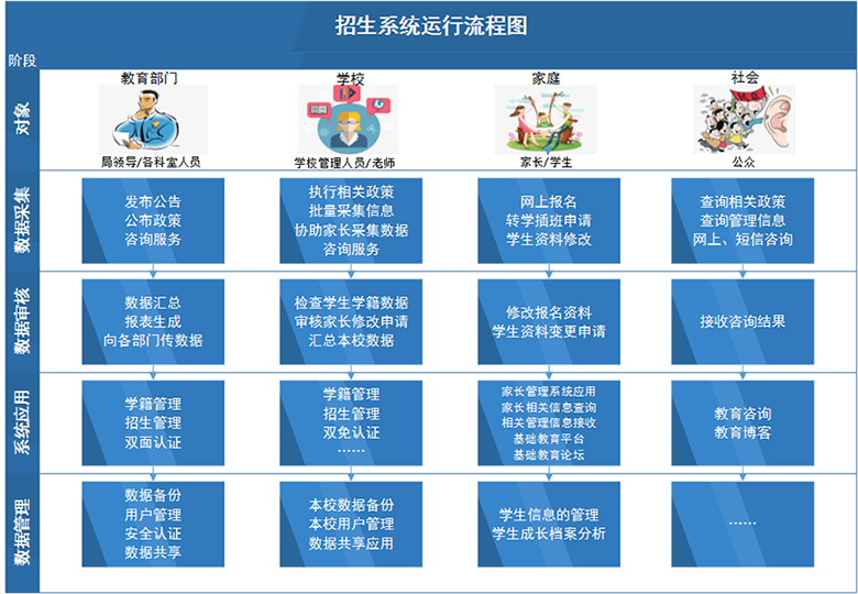 平台搭建后,通过该平台,教育部门可以通过门户网站发布信息、考试政策等;学校可以办理学生的入学/转学/报到/学籍管理等;家长则可以通过该平台实现网上报名和进度查询。三方面人员全部参与到报名招生过程中,使原本全部压在教育部门与学校上的工作,分配部分到早已积极想参与其中的家长和学生们,减轻了基层工作量,同时也真正的实现了全民参与,增加了政府部门与老百姓的互动交流。